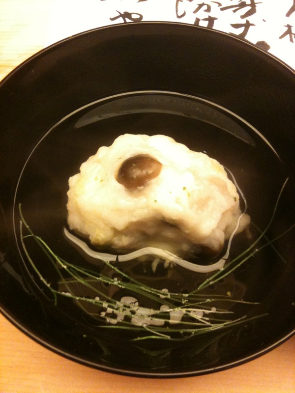 椀盛の白いハモ身丈の中には、貝柱、シメジ、銀杏が入っています。