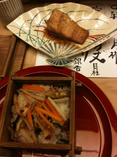 鰆の照焼きと、木原木蒸しと言って、餅米に柴漬けとワカメ、焼き穴子を蒸篭蒸しにしたものです。