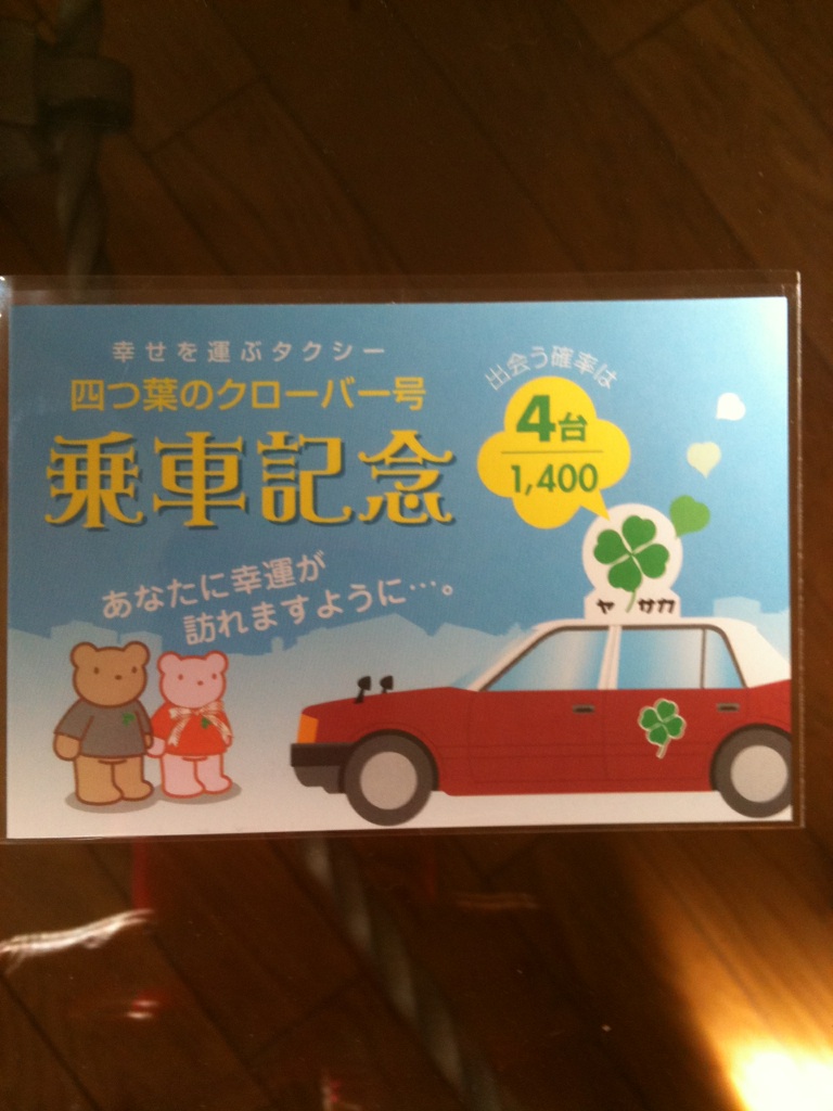 三つ葉マークのタクシー会社、1400台の中で4台だけ四ツ葉マークの車輌があり、その車輌に乗ると幸運が訪れると言われているそうです。